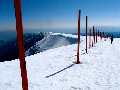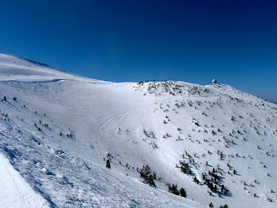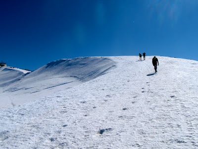 Bon, le sommet est derrière nous, maintenant, et on dévale à présent les pentes plein sud couvertes d’une neige molle, chauffée par le soleil. Pas évident !