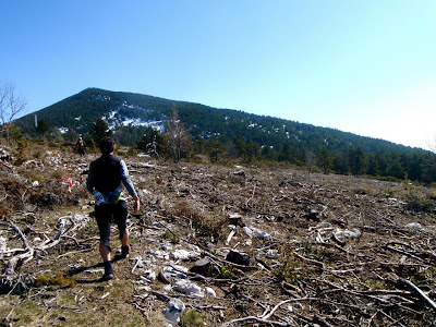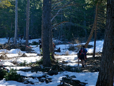 Enfin le ravito. Un festin en 4 minutes chrono. Puis c’est reparti sur une neige encore plus molle. Là, je commence à en avoir marre de patauger. On descend, on descend, et la neige se raréfie.