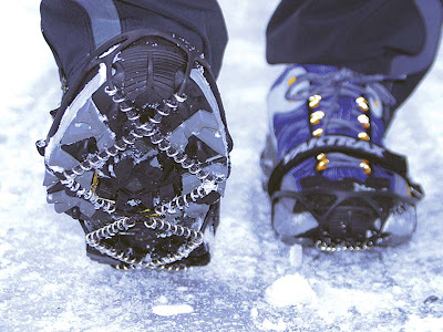 Et c’est reparti sur une neige bien damée, bien glacée, bien glissante… Je redouble d’effort pour suivre mes compagnons de course, et en me demandant comment ils font pour tenir debout dans les dévers, je m’aperçois qu’ils ont aux pieds ces fameux Yaktrax, les chaînes du trailer !