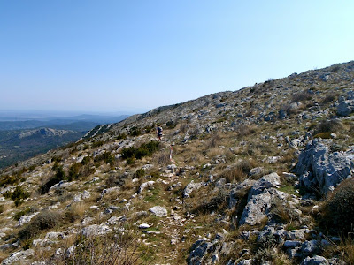 Ouf ! On est arrivés en haut… On galopera sur la crête jusqu’à la Croix de Provence, dans un champ d’herbe et de terre bien souple… sauf qu’affleurent à sa surface des lames de calcaire, des pics, des saillies, des pointes, des éperons de roches qui font que courir est très difficile, et qu’il faudra être vigilant pour ne pas se fouler une cheville !