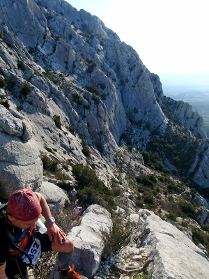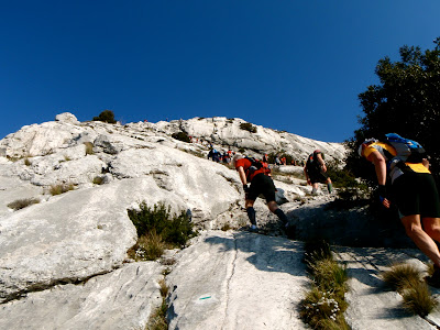 Puis l’ascension deviendra vite très éprouvante. Il fait chaud, très chaud. On est plein sud, en plein cagnard. Sur des rochers blancs, qui nous renvoient la chaleur en pleine face. Par deux fois je passerai des coureurs atteints de crampes, allongés en travers du chemin…en les enjambant ! (et en m’assurant, bien sûr, qu’ils n’aient besoin de rien…)