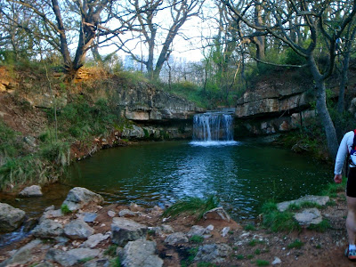 L’arrivée à Baudino sera difficile, et on redescend dans un chaos de rocs, puis on retrouve le parcours que l’on avait déjà emprunté à l’aller lors de l’approche de la Sainte Victoire. Cette partie, d’ailleurs, sera très difficile, et pour les cuisses, et pour le moral. Car une petite dizaine de km nous attendent, sur des chemins le long des vignes, des pistes sans intérêt, des bords de route, etc… Quand on quitte des paysages à couper le souffle pour se retrouver dans une plaine qui à côté fait pâle figure, et qu’en plus il faut courir, courir, courir, sinon c’est perte de temps assurée, avec des jambes flinguées par les ascensions et descentes successives… J’avoue que là, j’ai compté les km. Voire les centaines de mètres. On repassera par la petite planche jetée en travers du cours d’eau, dont je tomberai pour la petite histoire…