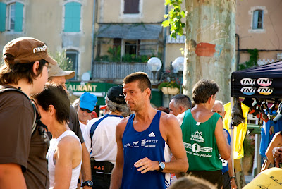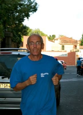 Puis c’est le départ des « grands ». Pas loin de 30° à l’ombre. Dans le peloton serré derrière la ligne de départ, attendant l’arrivée de la moto ouvreuse, tout le monde dégouline déjà. Moi je me demande déjà ce que je fais là. C’est drôle, on le sent quand ça ne va pas bien se passer. J’ai hésité à m’inscrire, je n’avais pas du tout récupéré de mon vol de la veille. Grosse fatigue, pas de motivation si ce n’est celle de participer à cette petite course « chez moi » : je ne me voyais pas attendre les copains sans la courir !