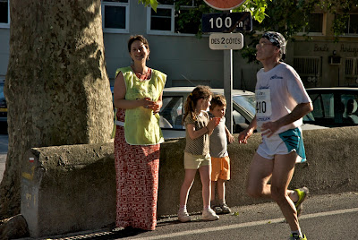 Là je croise Jacques, bien meilleur coureur que moi, courant en sans inverse : « J’attends Joëlle! ». Lui aussi a jeté l’éponge. Ca ne m’aide pas pour continuer. Moi aussi j’ai envie de laisser tomber. Le chrono va être catastrophique. Et alors ? Je décide de prendre la course comme une séance de footing, mais même comme ça c’est dur. Je souffre de la chaleur. On me double, à gauche, à droite. Comment font-ils pour courir par cette température ? Chapeau à tous…