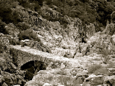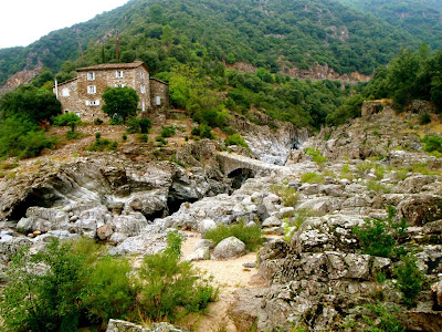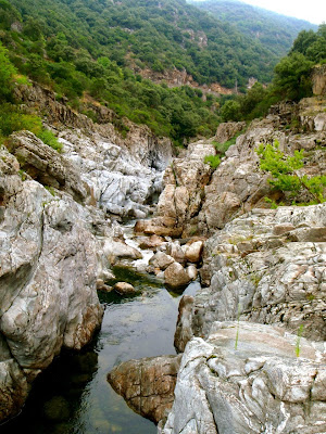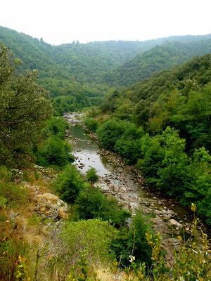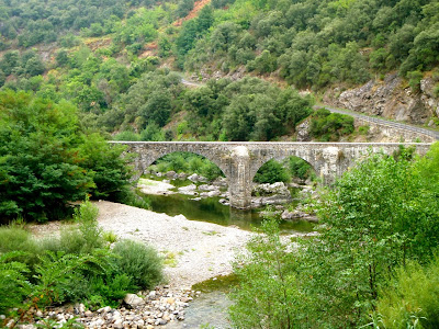 Là, il m’est tombé tellement d’eau sur la tête que j’ai renoncé à suivre la boucle que je m’étais préparée, à savoir l’ascension du Capel. J’ai donc continué à suivre la petite départementale jusqu’à St Martin de Corconac sur la rive du Gardon. Puis, avisant sur ma droite un petit sentier prometteur, je me suis félicité par la suite de l’avoir suivi… Car ce sont des vues splendides sur le Gardon, ses gourds, ses rocs, et ses vieux mas et ponts en pierre qu’il m’a permis d’admirer…