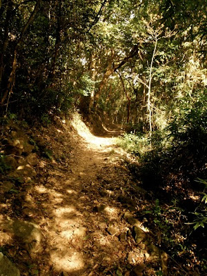 Puis, au 20è kilomètre, je décide de tenter une disgression. Je quitte le Hong Kong Trail. C’est beau, c’est vrai, mais un peu lassant de tournicoter dans tous les sens. J’avise un petit sentier tout droit dans la pente, avec un écriteau stipulant que vu l’état de végétation encombrant la piste, il est déconseillé de poursuivre plus loin. Bof, j’ai bien envie de tenter l’ascension de cette pente à plus de 50%, qui me conduira au sommet du Mont Cameron.