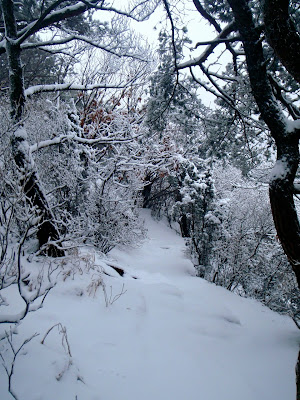 C’est sûr que c’est un vrai plaisir que de fouler le premier cette neige fraiche. Mais c’est aussi un désagrément : parfois le sentier est très difficile à trouver, il n’y a aucun indice de la trace à part une trouée entre les troncs. Beaucoup d’hésitations et d’erreurs de parcours à déplorer!