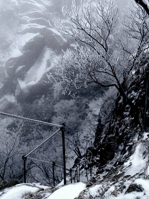 Le sentier remonte sur la crête, avec l’aide de barrières de fer gelées, et de cordes dures comme du bois. Équipé d’une simple paire de gants en soie, je ne sens plus mes doigts. Pas très montagnard, tout ça. Mais courir avec des gants de ski me semblait pour le moins ridicule…