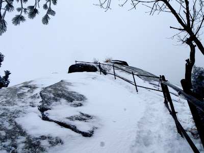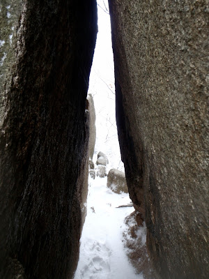En effet le sentier grimpe à flanc de falaise après le premier virage, aussi je renonce à le tenter avec cette neige glissante. Je fais le tour du roc, sous le regard moqueur de deux corbeaux qui ne se gênent pas pour m’afficher.