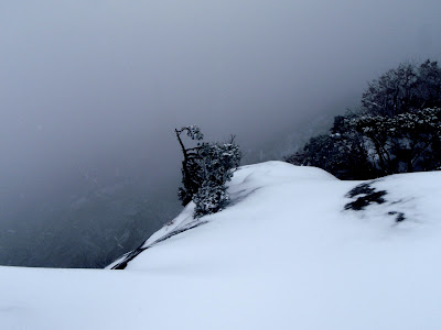 Sur la crête, le vent est glacial et tourbillonnant. Il soulève des nuages de flocons et dresse des congères. Le paysage est parfois noyé dans le brouillard si bien qu’on a l’impression d’être suspendu dans le néant…
