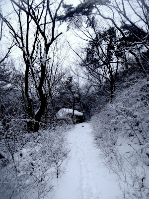 Alors évidemment je n’aurai pas pu réaliser la traversée totale des deux parcs nationaux à cause des conditions météorologiques. Entre le temps perdu à chercher le bon chemin caché sous une épaisse couche de neige, et à déchiffrer les « nouilles » coréennes des panneaux d’information (c’est-à-dire en comparant un à un les caractères inscrits sur ma carte elle aussi en coréen), il m’aura manqué facilement trois heures pour boucler la traversée. J’aurai quand même pataugé dans la neige pendant 7 heures ! L’approche de la nuit m’aura dissuadé de poursuivre plus avant, m’engageant sur un terrain inconnu et apparemment, vu la carte, très montagneux.
