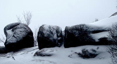 A l’horizon, le mont Obong, reconnaissable, même par ce temps, à ses cinq sentinelles. Puis je redescends sur une pente glacée.