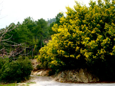 En approchant du Pic d’Arbousse, une bonne surprise : un massif géant de mimosas arbore déjà ses fleurs d’or… Il ne manquait que le soleil pour que l’arbre s’embrase !