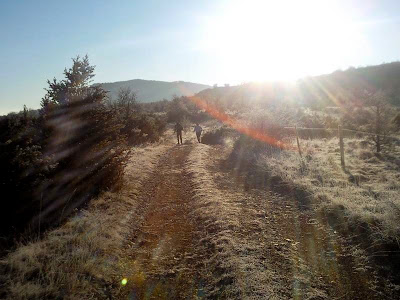 La température est à son minimum, l’herbe crisse. La boue a figé les empreintes des troupeaux. Ma gourde, malgré qu’elle soit sans cesse secouée, est remplie de glaçons. L’embout est bouché par la glace, pendant 30km je ne pourrai boire une goutte. Même mes tubes de gel sont tellement pâteux qu’ils sont inutilisables. De toutes façons j’ai l’estomac dans les chaussettes, je ne peux rien avaler. J’admire au passage les bénévoles, transis de froid près d’un feu de camp, debout toute la nuit, et toujours le sourire aux lèvres… Au 55ème kilomètre ma vitesse de croisière s’effondre, comme prévu. La dernière descente, je la fais en marchant. Heureusement, Françoise arrive, elle m’a rattrapé, comme il se doit quand on dépasse les 50 bornes !  Elle saura me relancer, et on finit ensemble, en 8h35, 18ème au scratch… Et 1ère féminine pour elle, avec quasiment une heure d’avance sur la 2ème !!! Une vraie championne d’ultra cette Françoise Barrière !