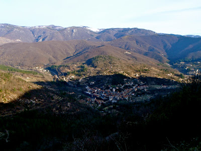 là dans la nuit on a envie d’éclairer… Mais non, on voit juste les lumières d’Arre et de Bez. Et les étoiles glacées au-dessus. Au moins on ne s’arrête pas… On continue la course, tête baissée, à fixer ce halo de frontale, toujours le même depuis maintenant 6 heures… Cette petite tache de lumière blafarde qui éclabousse les quelques pierres et racines devant nous… une lumière crue, sans ombre, car la frontale étant fixée comme son nom l’indique au front, l’ombre projetée de l’obstacle se cache derrière lui, ce qui lui ôte tout relief, toute information de hauteur : souvent le pied butte sur un bloc qu’on avait sous-estimé… J’ai même parfois pensé que la pierre, pour se venger d’avoir été réveillée, se dresse devant la chaussure…