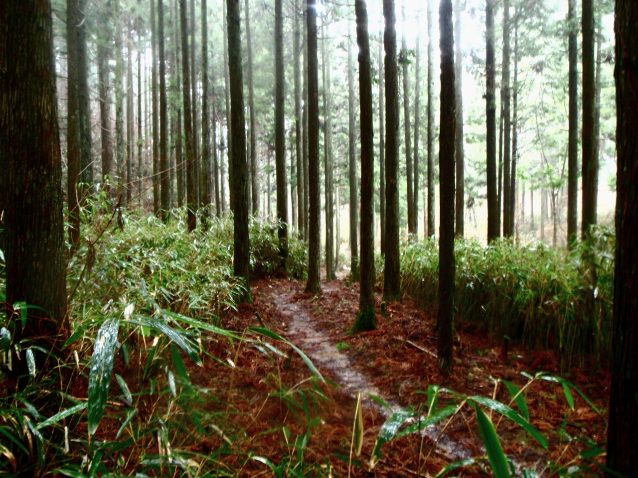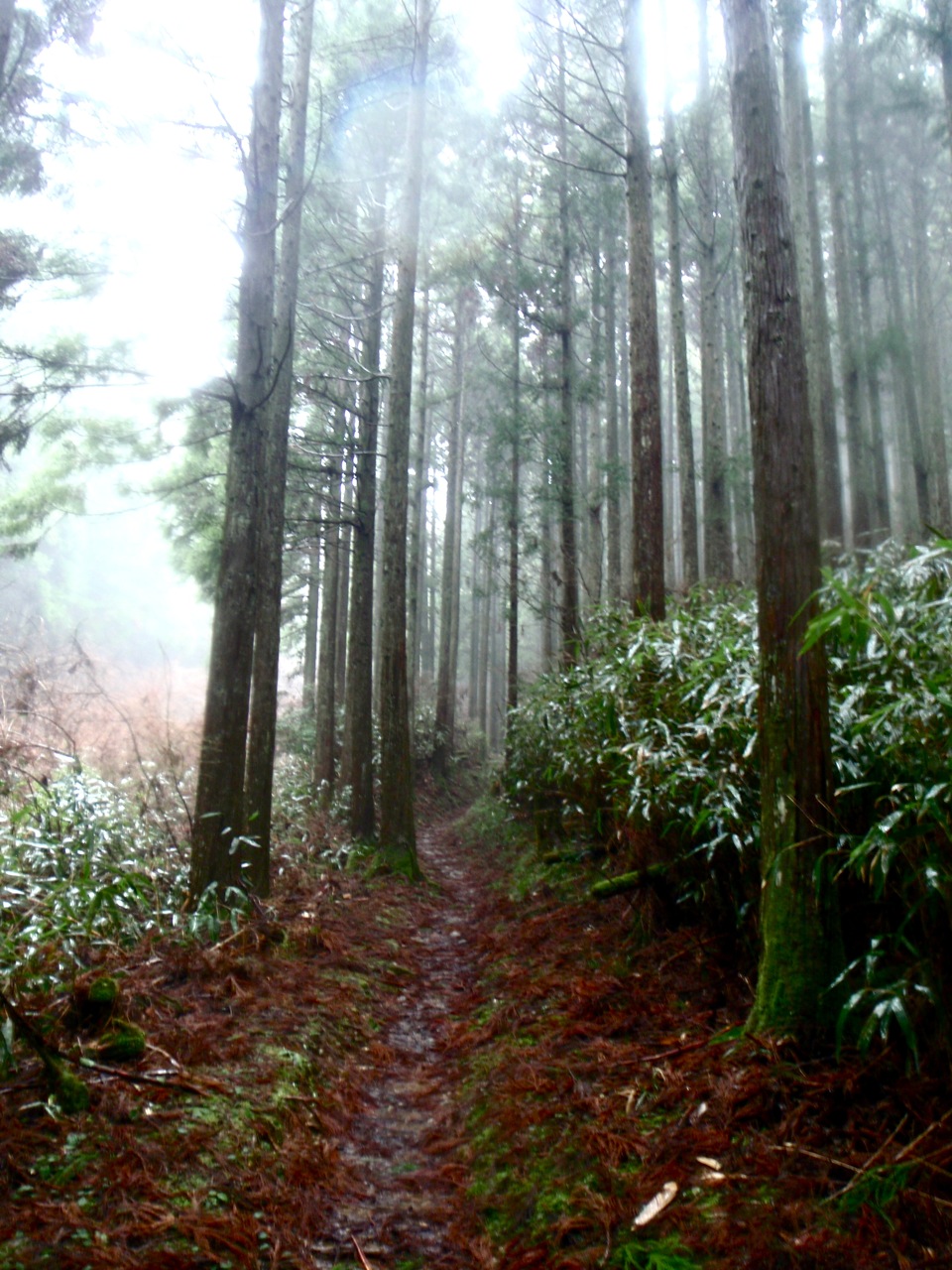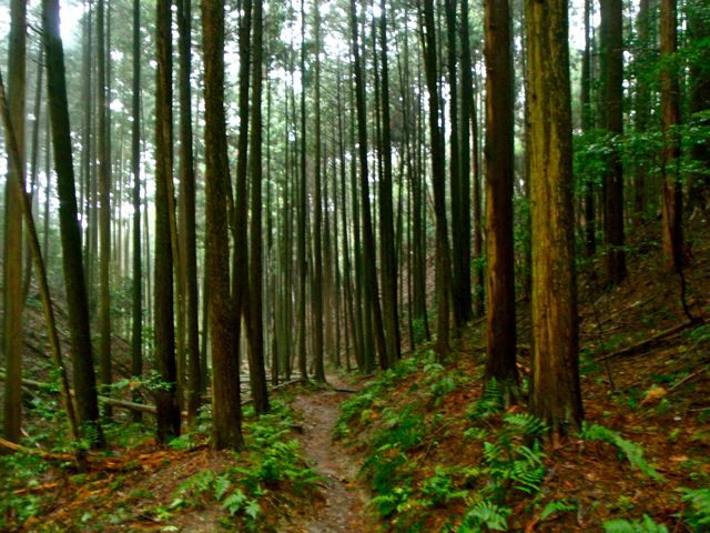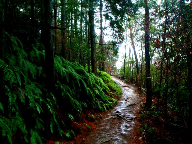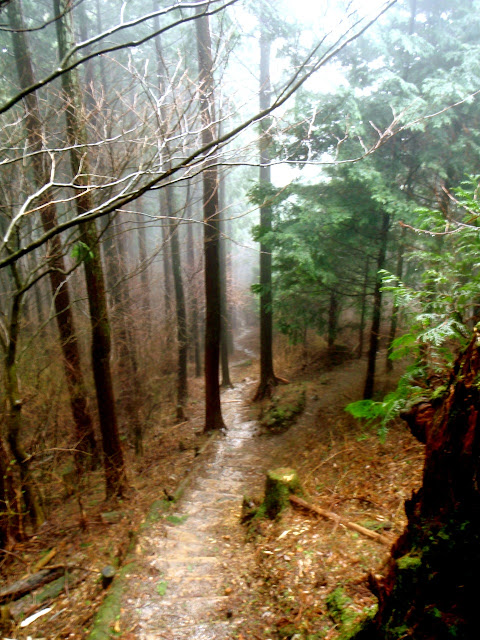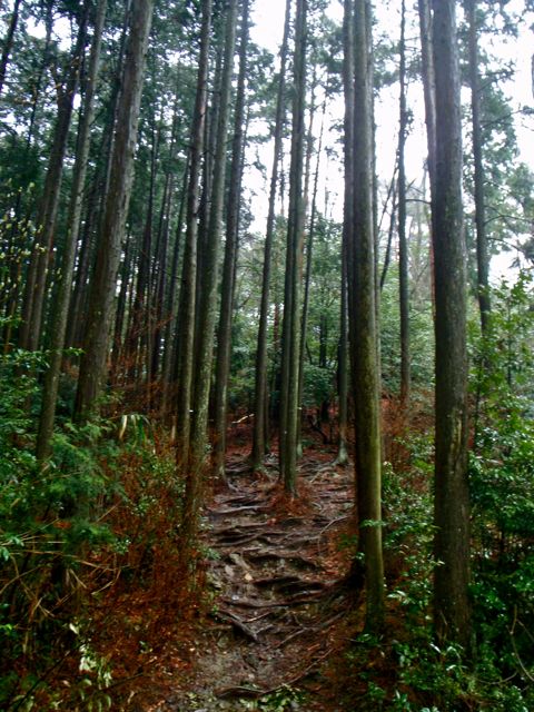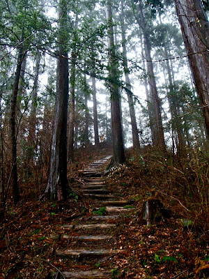 Le sentier serpente au milieu des cèdres noirs. Les marches sont centenaires. Les arbres, plus vieux encore, en sont témoins. Il escalade la montagne, sans cesse. On s'élève, par le corps, et par l'esprit. Au bout d'un moment, je n'entends plus d'oiseaux. La pluie tombe toujours, mais sans bruit. Je prends conscience du silence comme s'il s'était imposé brutalement : j'ai l'impression d'avoir du coton dans les oreilles. Seuls mes pas sur le sol spongieux troublent la sérénité des lieux. Je m'arrête souvent pour goûter le silence parfait.