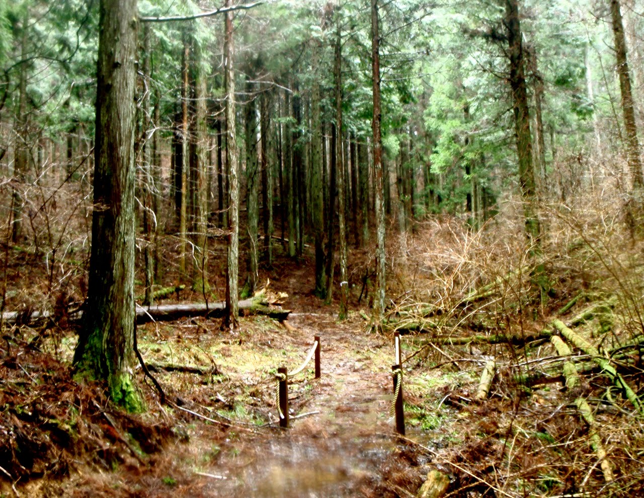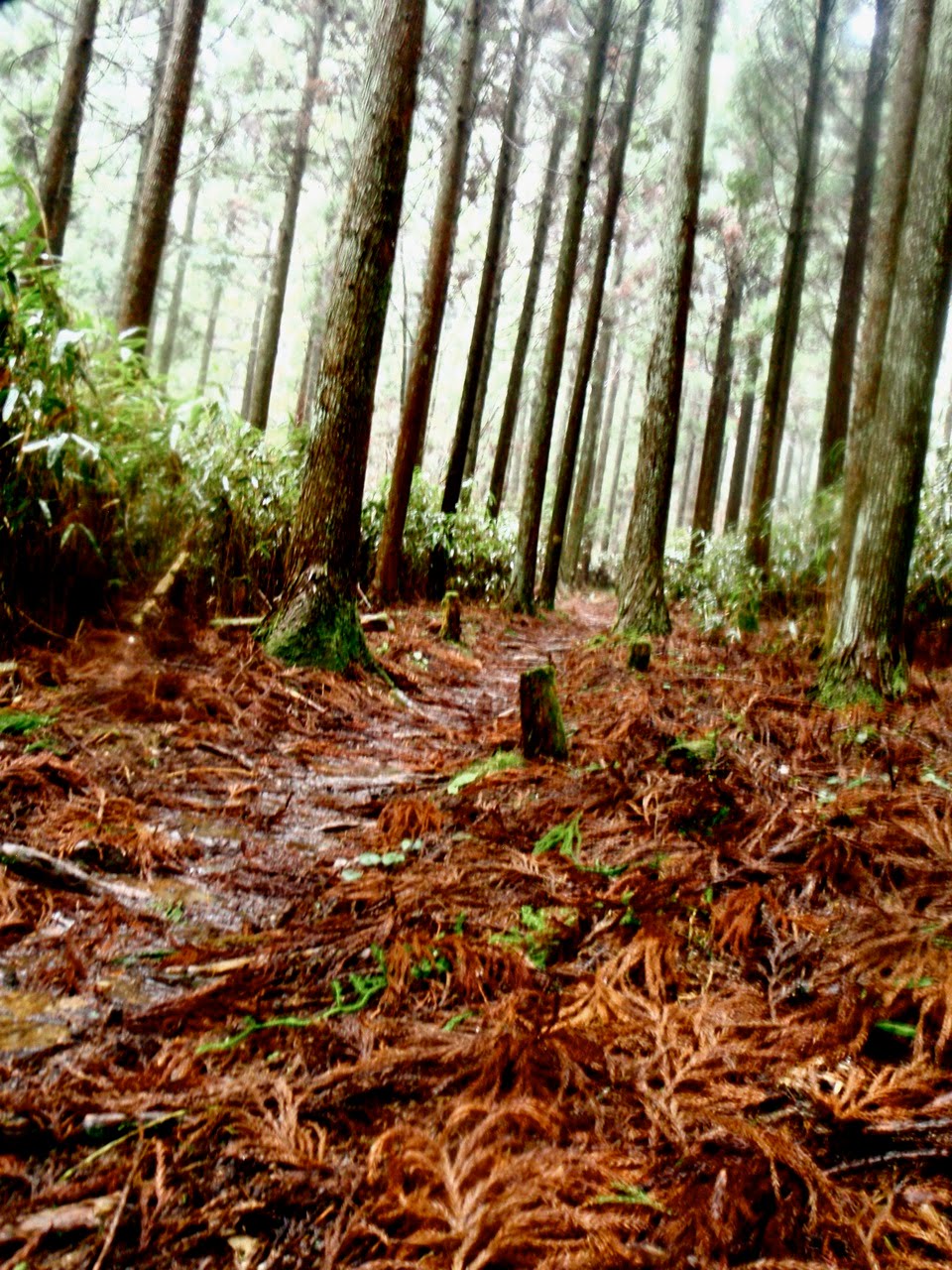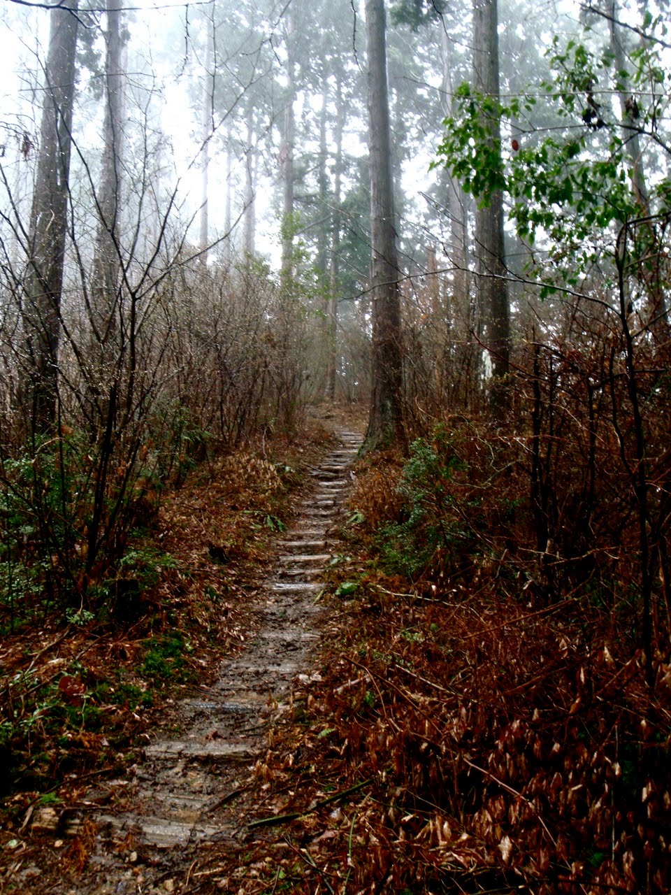 Le sentier serpente au milieu des cèdres noirs. Les marches sont centenaires. Les arbres, plus vieux encore, en sont témoins. Il escalade la montagne, sans cesse. On s'élève, par le corps, et par l'esprit. Au bout d'un moment, je n'entends plus d'oiseaux. La pluie tombe toujours, mais sans bruit. Je prends conscience du silence comme s'il s'était imposé brutalement : j'ai l'impression d'avoir du coton dans les oreilles. Seuls mes pas sur le sol spongieux troublent la sérénité des lieux. Je m'arrête souvent pour goûter le silence parfait.