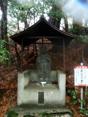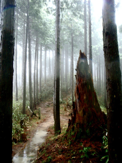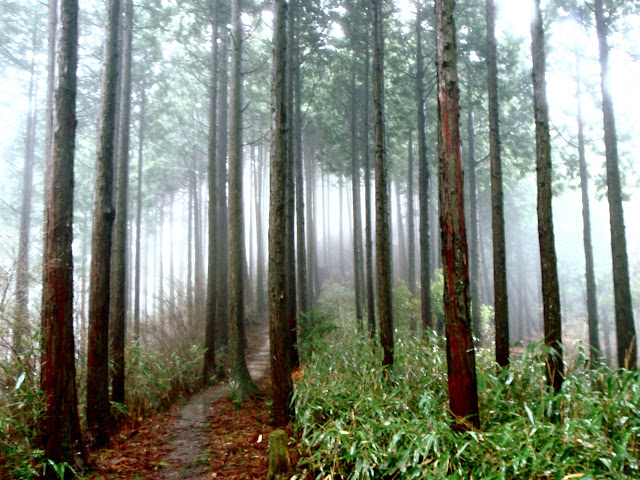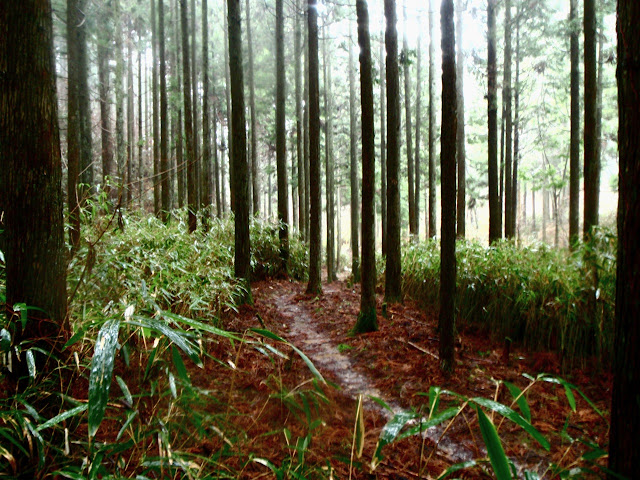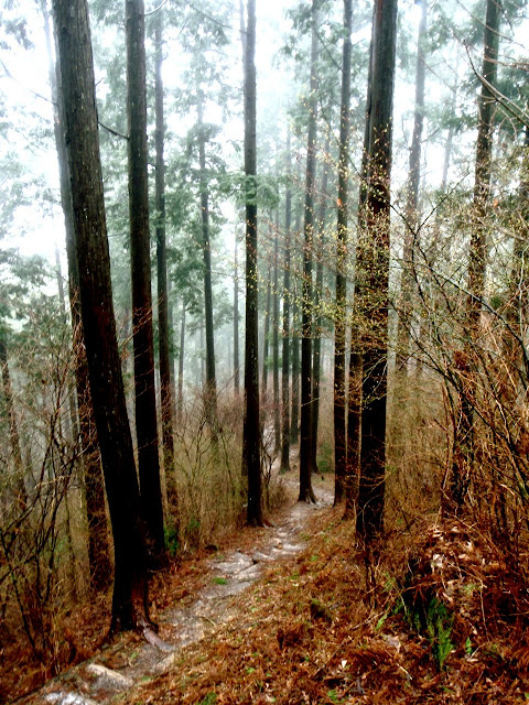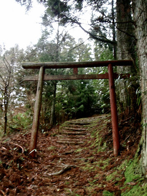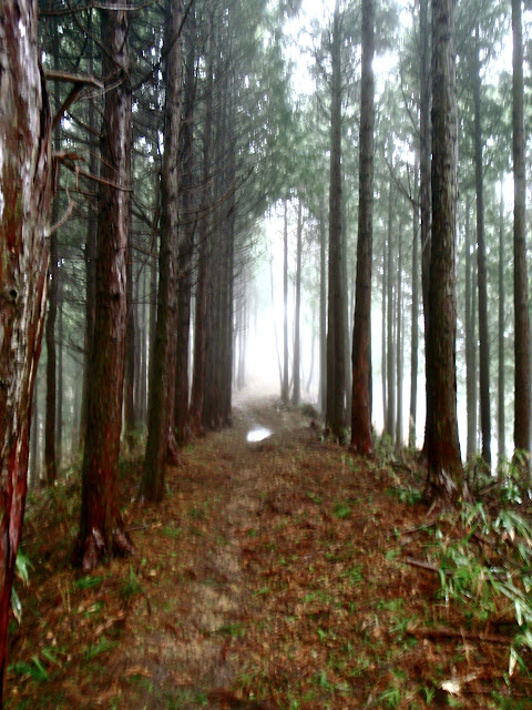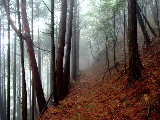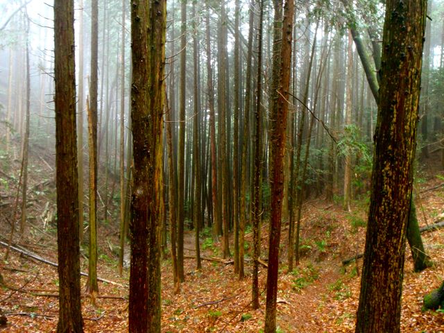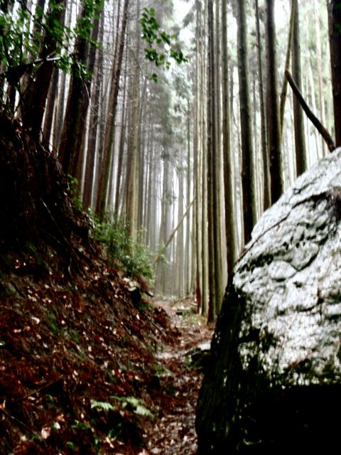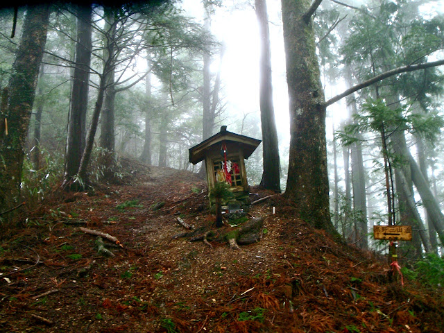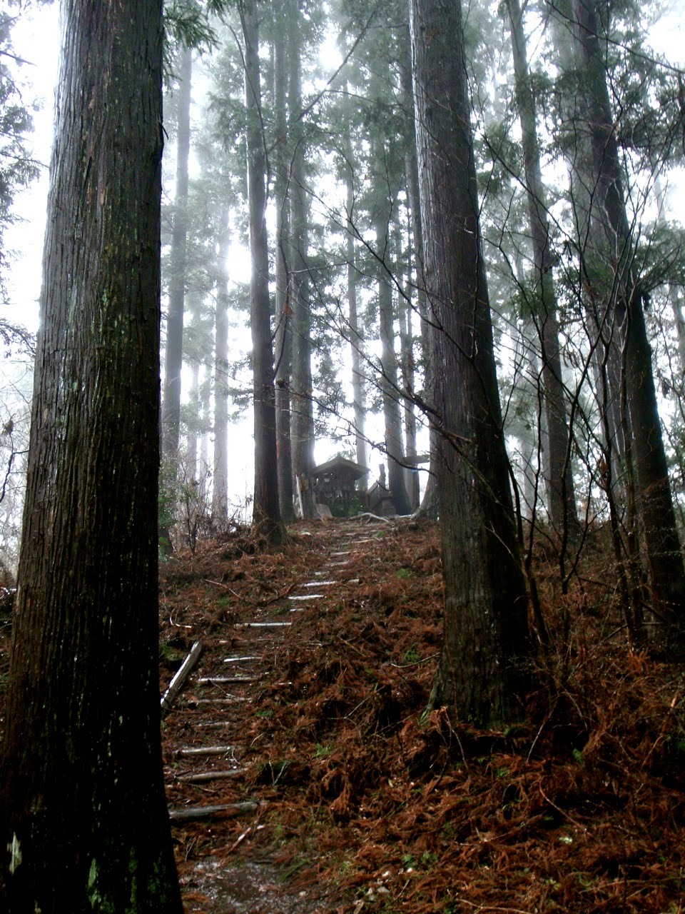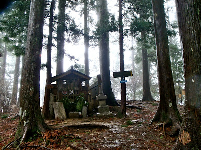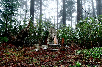 La brume s'est faufilée dans la forêt. L'impression est troublante : 50 mètre devant il n'y a rien. On entre dans le ciel. Des sanctuaires dédiés à des divinités marquent la route comme des bornes rappelant que l'endroit est sacré depuis le fond des temps. Pas la peine de le souligner, on s'en rend compte par soi-même.