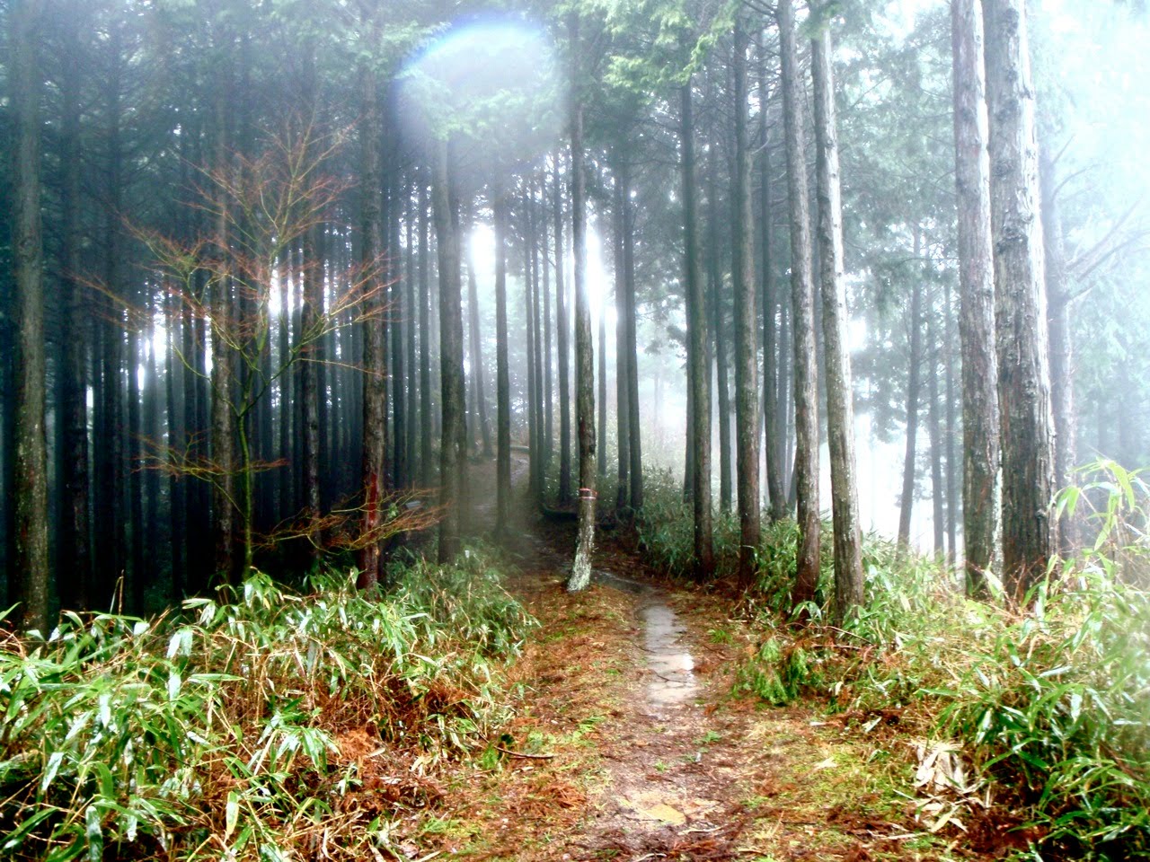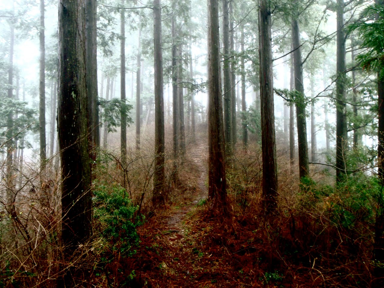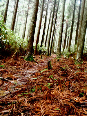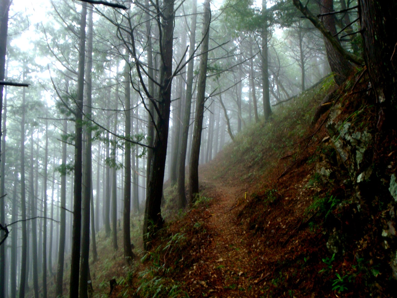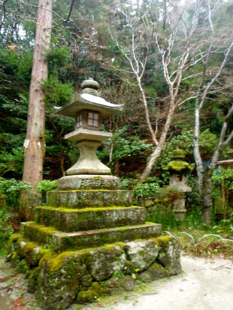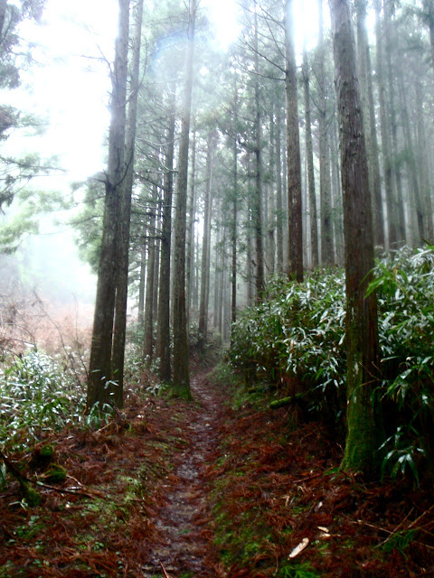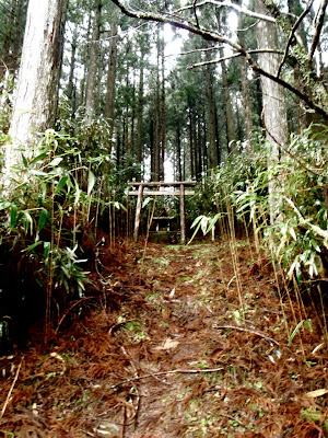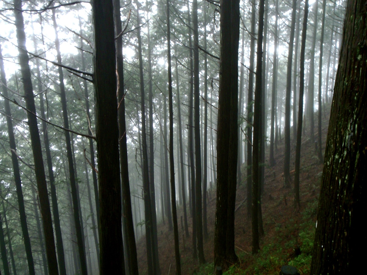 La brume s'est faufilée dans la forêt. L'impression est troublante : 50 mètre devant il n'y a rien. On entre dans le ciel. Des sanctuaires dédiés à des divinités marquent la route comme des bornes rappelant que l'endroit est sacré depuis le fond des temps. Pas la peine de le souligner, on s'en rend compte par soi-même.