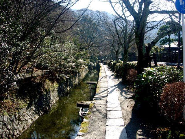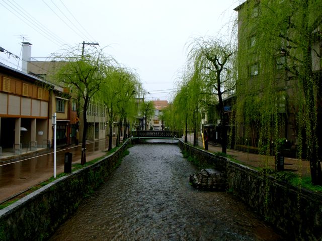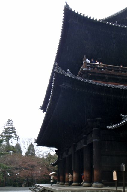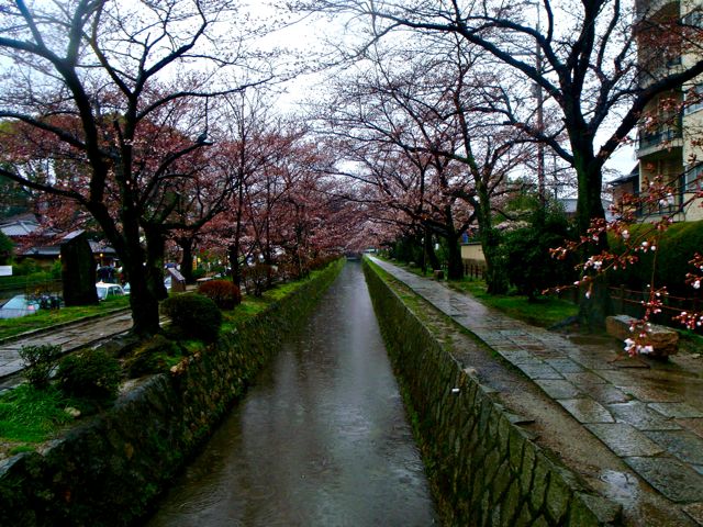 Kyōto, autrefois capitale impériale du Japon, entourée de montagnes. Fondée aux alentours de l'an 800 après JC, elle fut parfois dévastée et pillée au cours des siècles mais chacun des shoguns des différentes époques se firent construire des pavillons rivalisant de beauté. La ville compte 2000 temples, ses palais et ses jardins zen en font la capitale culturelle du Japon. Aujourd'hui la ville d'Osaka grandissant inéluctablement vient toucher Kyōto et doucement la pousser contre ses collines. J'emprunte, en guise d'échauffement, le chemin de la philosophie, célèbre sentier longeant quelques temples sous les cerisiers, qu'empruntait jadis le philosophe Kintaro Nishida. Impossible de ne pas avoir quelques pensées élevées ici… Sauf que la pluie ne me lâche pas. Le paysage est d'une délicatesse proprement japonaise. Mais la pluie délave le tableau. Les couleurs se fondent, les traits se diluent, la grisaille vient corrompre le raffinement. Kyōto sous le soleil, pour l'avoir visité il y a quelques années, c'est ça :