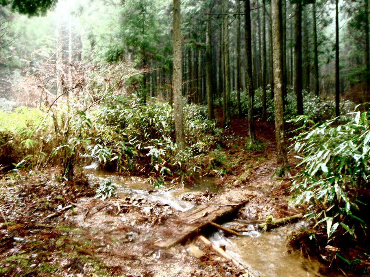 La pluie tombe toujours ; au fond des vallées, l'eau se regroupe en ruisseaux qu'il faut franchir sur des ponts de fortune.