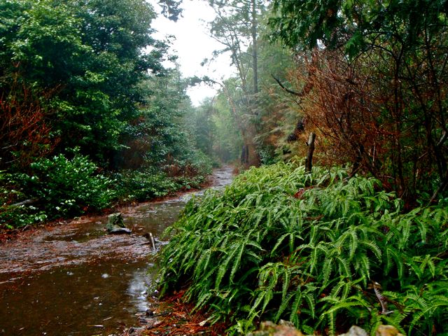 La boue est bien présente. Je pensais être à l'abri de la pluie dans la forêt. Erreur. Il pleut encore plus fort : les arbres captent toute l'eau du ciel, toute la moiteur de l'air, et déversent le tout sur mon passage. En deux minutes je suis trempé.