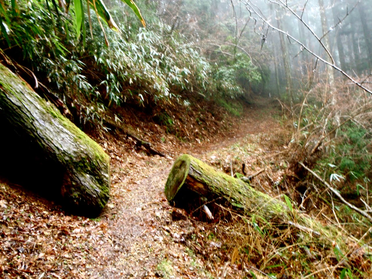Le sentier se déroule sur le dos des montagnes, monte, descend, mais la vue reste courte : dans le nuage, on ne voit pas à 50 mètres. Dommage pour le paysage invisible, mais cette brume renforce le côté mystique. Impression garantie !