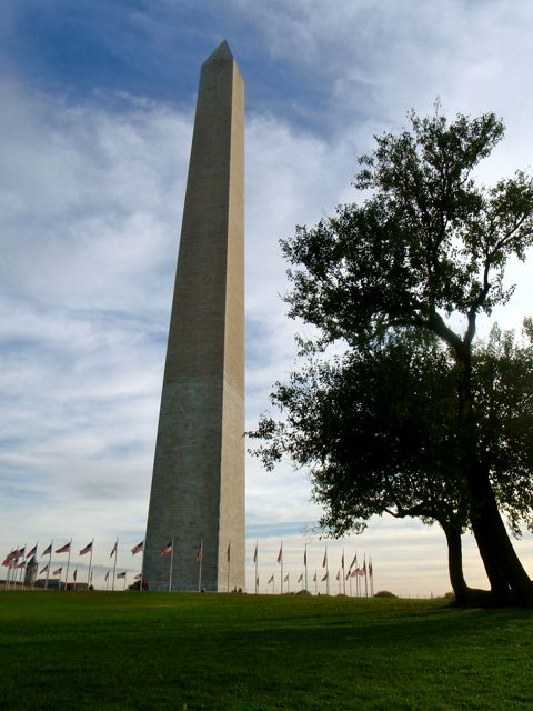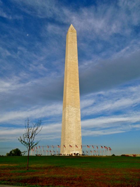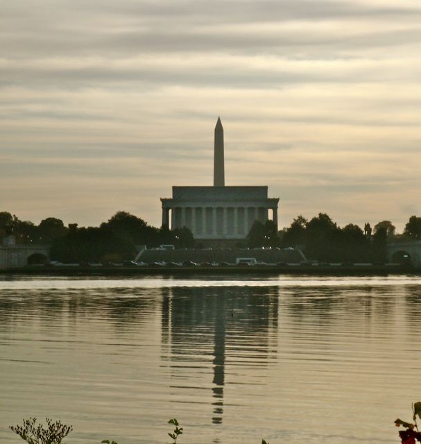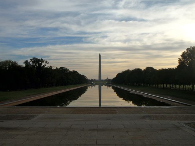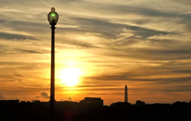À l’horizon se détache sur le soleil levant le Washington Monument.