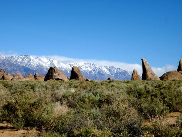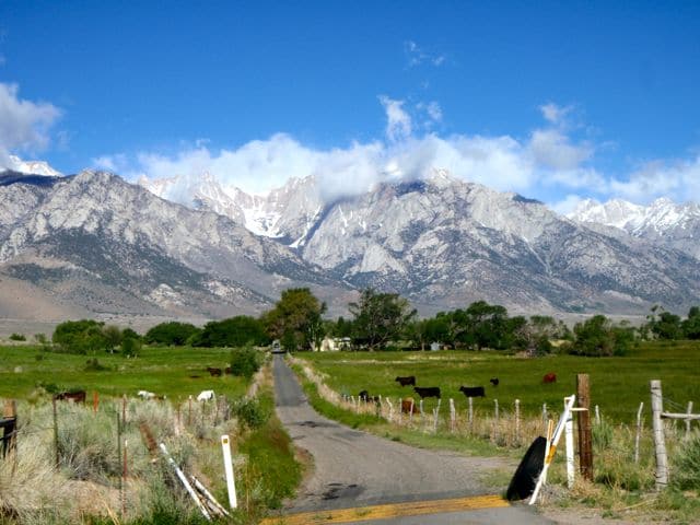 Vue des collines d’Alabama (c’est leur nom, pas l’État), la Sierra porte bien son nom puisqu’elle est encore enneigée. Et le blizzard d’hier en a redéposé une bonne couche… C’est là, près de Big Pine, petite bourgade au pied de la Sierra, que je me rends pour demander un permis d’ascension, obligatoire pour le mont Whitney. Ils me proposent le passe multi-days mais je leur explique que le 1-day-hike me suffira, je compte faire l’aller-retour dans la journée. L’été, c’est possible, me disent-ils, mais l’hiver, il faut alors passer par la voie alpine (mountaineer’s route) plus courte. Cela ne m’enchante guère, car si cette route n’est pas particulièrement technique (niveaux 3 pour les passages les plus durs), en hiver la glissade ne pardonne pas et il y a des morts tous les ans. Non, je préfère emprunter la voie classique, beaucoup plus longue (35km aller-retour).