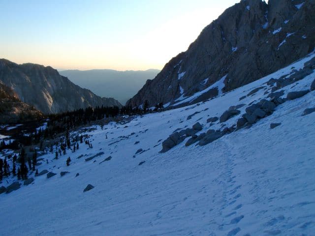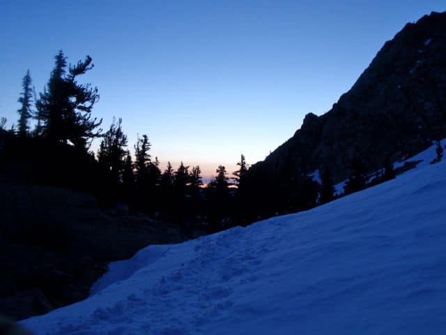 Je pars à 3h30 du matin, histoire d’avoir de la marge pour rentrer avant la nuit. Le départ se fait de Whitney Portal, le soleil n’est pas encore levé. Il ne pointera le bout de son nez qu’aux abords d’Outpost Camp, 700m plus haut et 2h plus tard. Je mets ma musique en route, spéciale Sierra Nevada… D’ailleurs, quand je l’écoute chez moi, si je ferme les yeux je me retrouve au beau milieu de la Sierra…