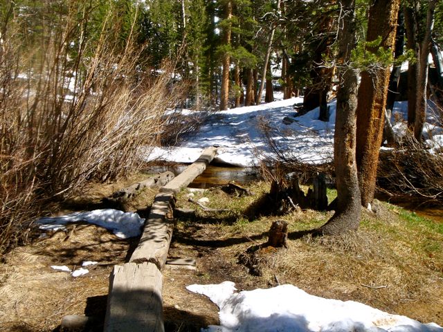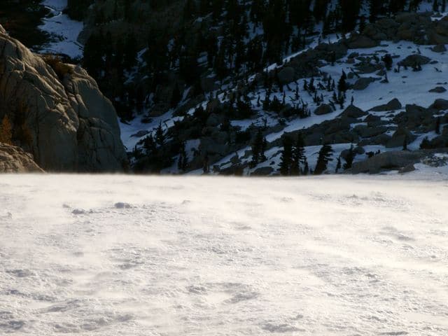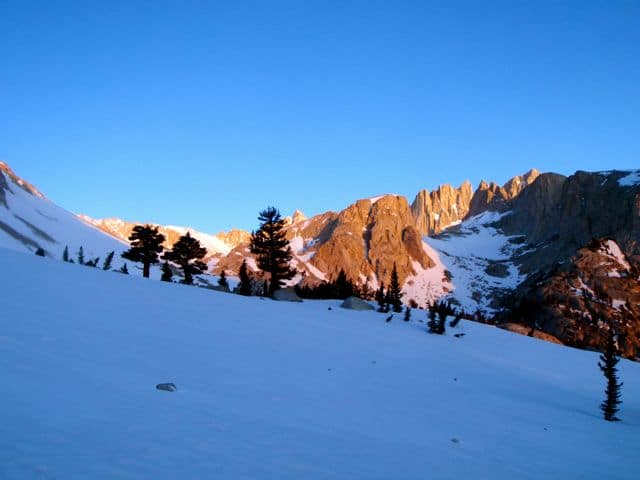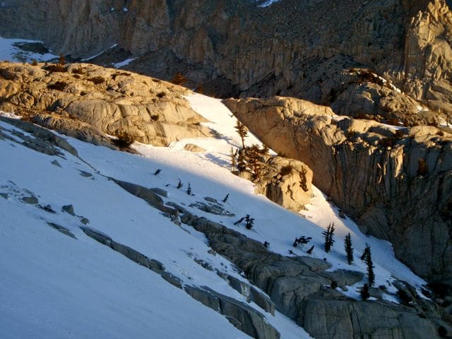 A partir de là, ma vitesse ascensionnelle diminue. Pour plusieurs raisons. D’abord, il y a nettement moins de traces dans la neige, les promeneurs s’arrêtent à Outpost Camp apparemment, et le chemin devient plus dur à suivre, pour finir à l’estime. Ensuite, l’altitude augmentant, l’effort devient plus difficile (on est déjà à près de 3200m). Mais surtout, le soleil caressant la pierre de la Sierra Nevada, le spectacle devient vite prenant et au lieu d’avancer je m’en mets plein les mirettes…