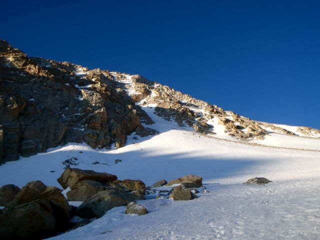 Voilà, je suis dans cette fameuse pente à 50 degrés. En bas, près du Trail Camp, un petit sommet appelé Trône de Wotans. La pente est sévère, surtout qu’on s’approche des 4000m à présent. Parfois la glace est compacte, et il faut bien planter crampons et piolet pour ne pas dévisser. Comme le soleil est assez haut dans le ciel, il commence à chauffer la glace qui se transforme rapidement. Je me hâte car si elle se transforme en neige lourde, je vais m’enfoncer et tout deviendra subitement plus difficile.