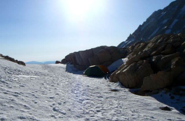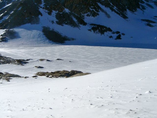 J’ai mis 8h pour monter. Avec cette neige, ce n’est pas si mal. Je mettrai 5h pour redescendre, il est midi, je serai donc rentré bien avant la nuit ! Je croise au retour mes deux alpinistes qui sont toujours empêtrés dans la pente de glace qui s’est transformée en pente de neige profonde… Je doute qu’ils atteignent le sommet, à moins qu’ils retournent dormir sous leur tente une deuxième nuit…