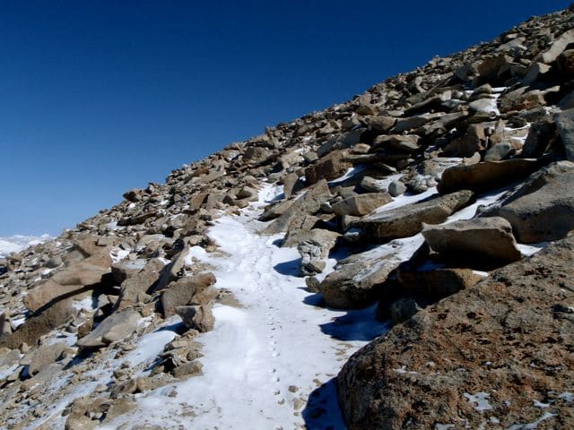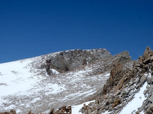 Je vais devoir monter sur cette crête, côté gauche, et la suivre de bout en bout, sur le dos du Needle, jusqu’à l’autre extrémité : le mont Whitney proprement dit, que l’on aperçoit sur la photo ci-dessous, en arrière-plan.