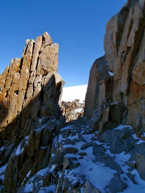 Le sentier n’est pas très facile ; parfois le vide n’est pas loin et la glace recouvre les rochers, rendant leur franchissement dangereux. Le vent, plus fort de ce côté-là de la montagne, rend les choses encore plus difficiles. Je remets donc mes crampons pour ne pas risquer la chute, mais les griffes de métal, si elles mordent bien la glace, ne tiennent pas en revanche sur la roche… Il faut donc composer…