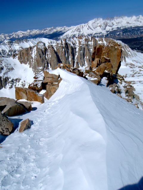 Lorsque j’arrive en haut, près de Discovery Pinnacle et le chemin de crête, je remarque deux alpinistes en bas de la pente que je viens de gravir en environ 1h, qui m’observent d’en bas et suivent visiblement mes traces (les seules). J’arrive au col, enfin. Mon regard bascule de l’autre côté, vers l’ouest, et la Sierra Nevada. Le mont Hitchcock se dresse juste devant moi (mais plus bas que moi, hé hé),