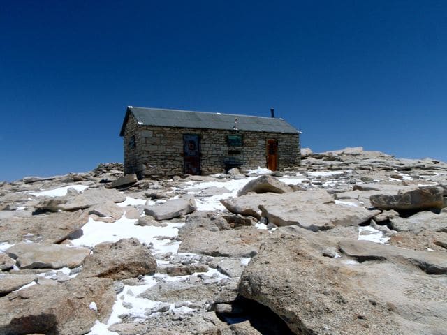 C’est un abri, construit en 1909 pour s’y réfugier en cas d’orage car la foudre tombe ici très fréquemment et sans prévenir, des panneaux avertissent partout du risque, le danger est important. On l’appelle Mount Whitney Smithsonian Institution Shelter car c’est la Smithsonian Institution qui l’a utilisé dès 1909 pour conduire des observations spectroscopiques de la planète Mars, puis des études sur les phénomènes en haute altitude, avant que les vols en avion ne soient possibles.