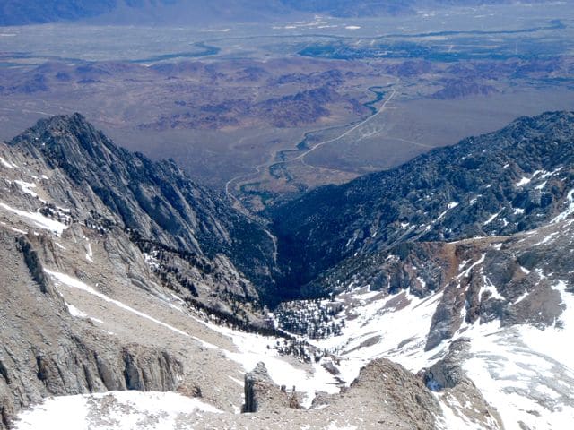 4417m. 4421m même d’après les dernières mesures. En bas, sous mes pieds, 2600m plus bas, la route qui mène à Lone Pine. On se croirait en avion tellement tout est petit.