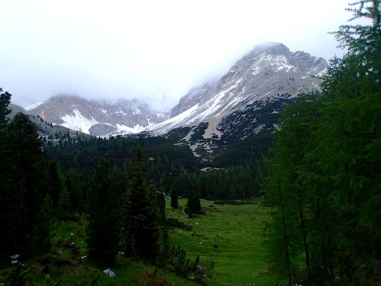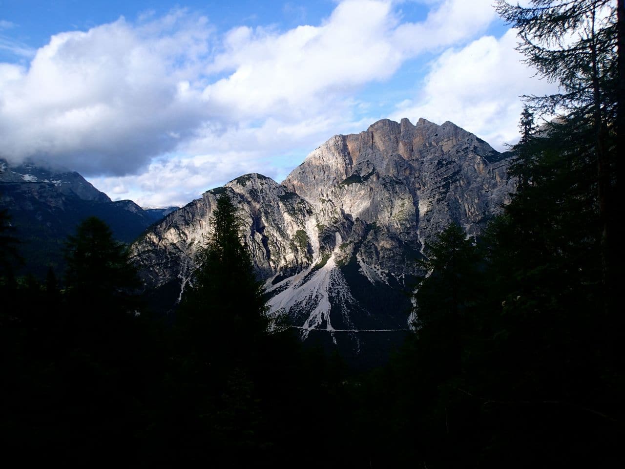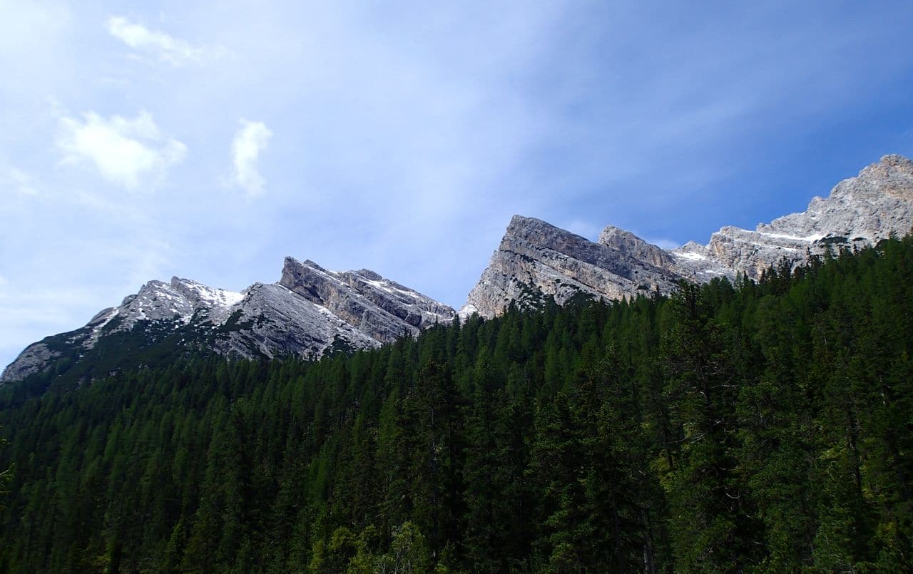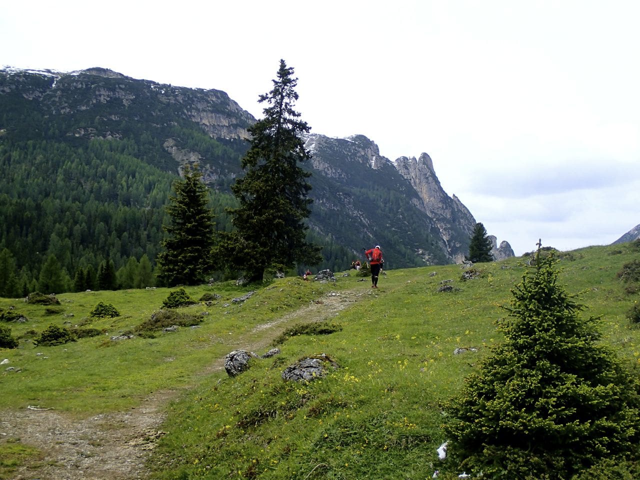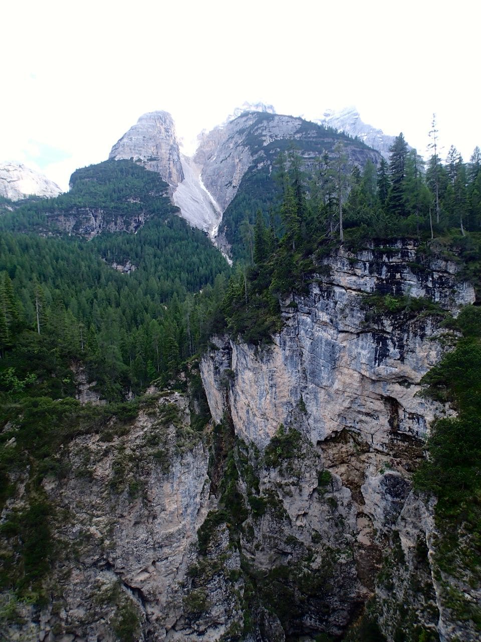Tout au bout de cette vallée, au pied du Croda Rossa justement, on descendra au fond, et on empruntera une vallée perpendiculaire, à droite sur la photo ci-dessus : le Val Padeon. On remonte le cours d’eau du Ru Bosco, dans une forêt de sapins de laquelle dépasse les pics du Crépe de Zumèles.