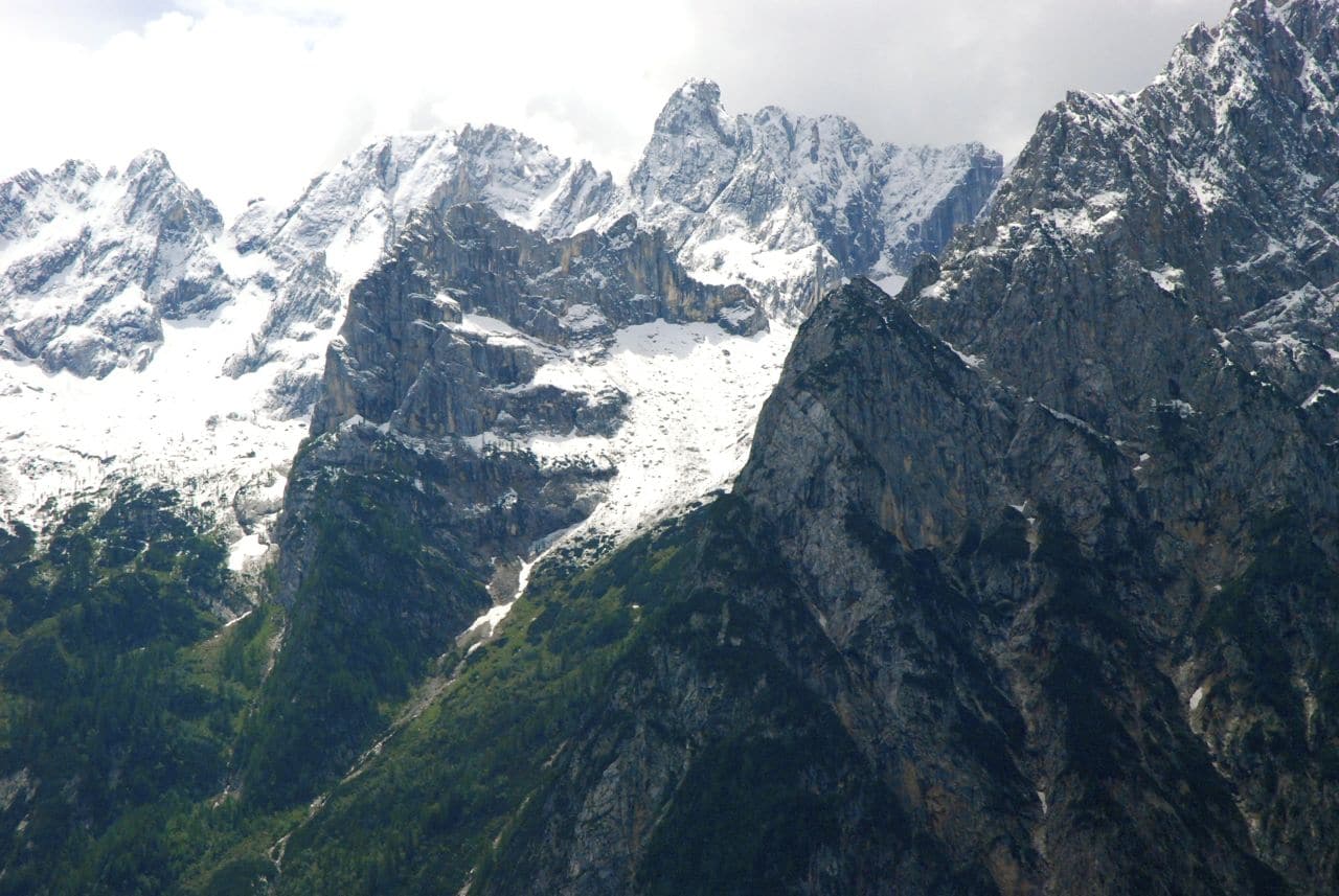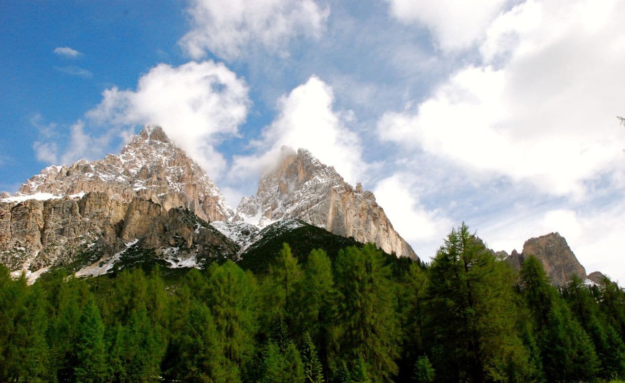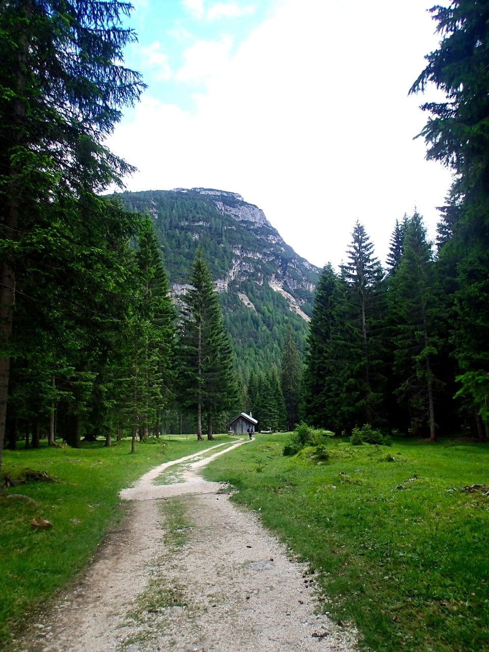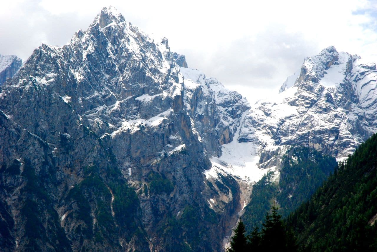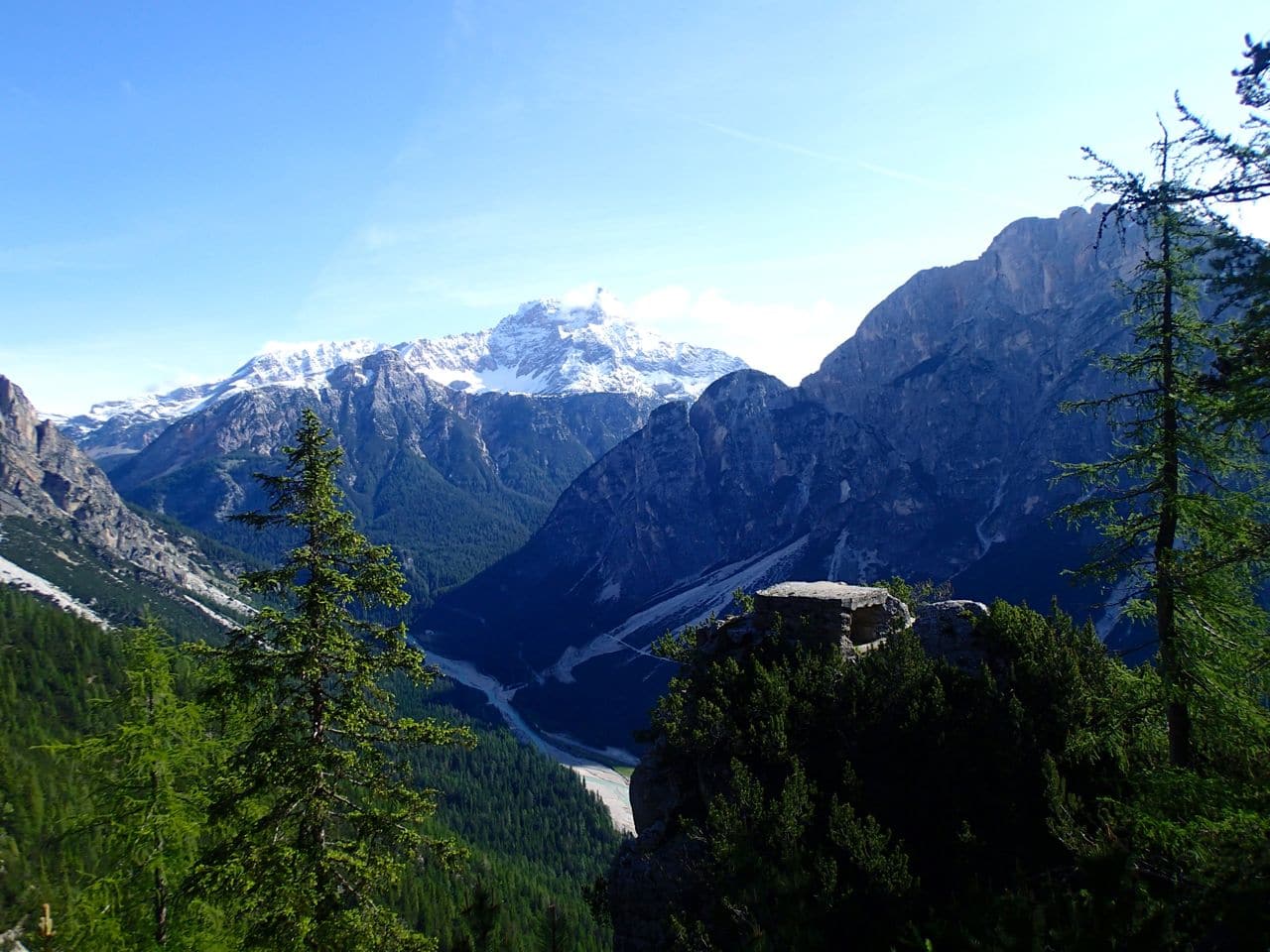 Tout au bout de cette vallée, au pied du Croda Rossa justement, on descendra au fond, et on empruntera une vallée perpendiculaire, à droite sur la photo ci-dessus : le Val Padeon. On remonte le cours d’eau du Ru Bosco, dans une forêt de sapins de laquelle dépasse les pics du Crépe de Zumèles.