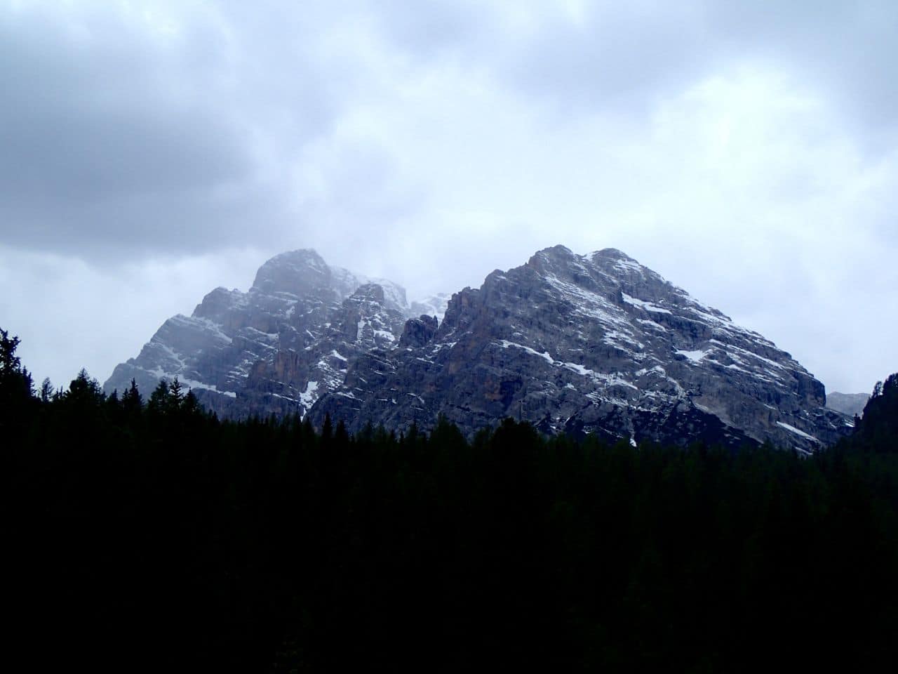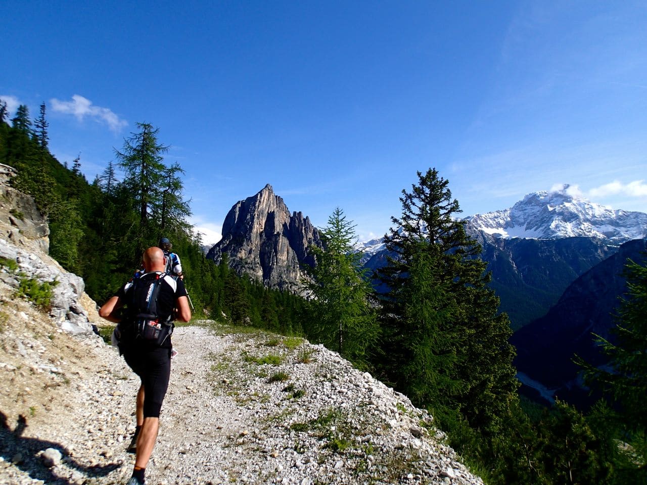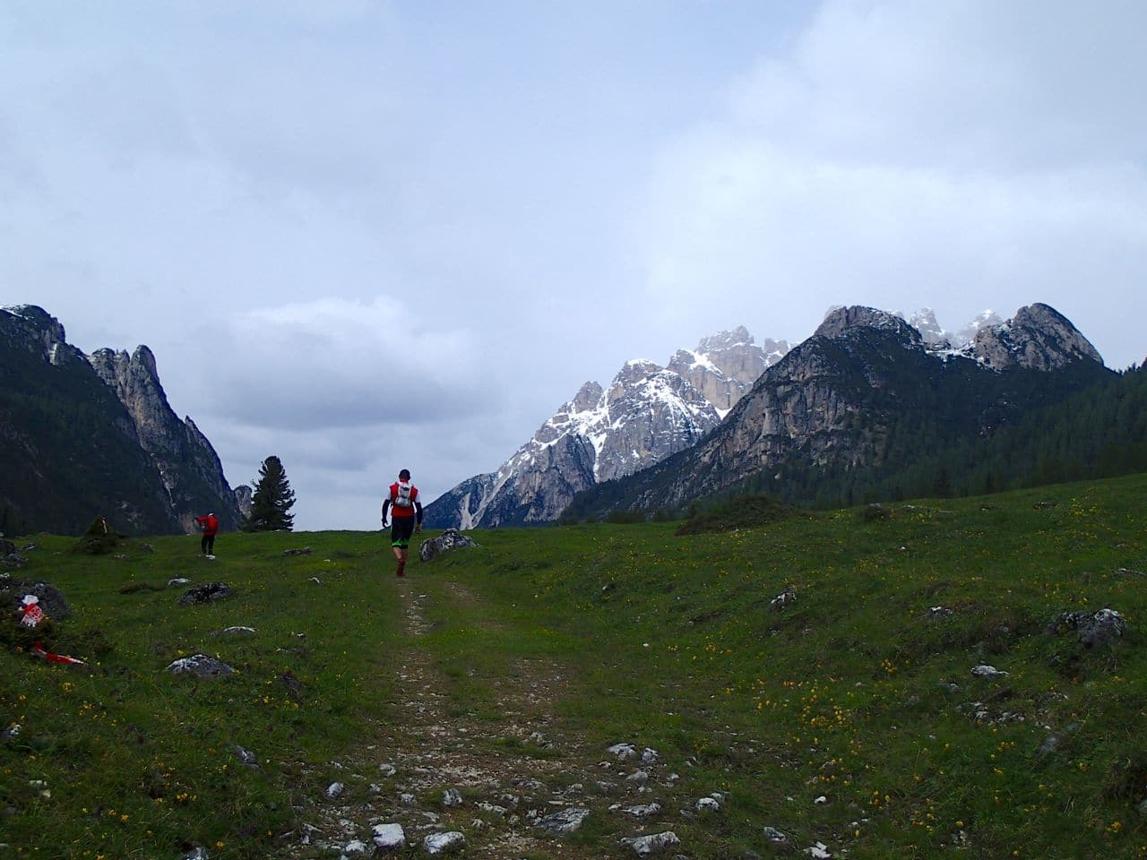 Une longue longue descente nous amènera au Lago di Landro, puis à Carbonin. Comme les pluies ont fait gonfler les lacs qui ont débordé et inondé les abords, on délaissera les sentiers pour une piste cyclable plus en hauteur. Le résultat : 5km d’un faux plat interminable où la marche est proscrite. On en est environ au 50ème kilomètre, les cuisses grimassent, surtout les miennes. Elles couinent. Tant pis pour elles, il faut courir. On arrive enfin à Cimabanche. Re-re-pointage, re-re-ravito. Et on repart, enfin une petite ascension ! Je les attends avec délectation maintenant… Le Croda Rossa, aperçu dans la matinée en fond de vallée, est maintenant perdu dans les nuages.