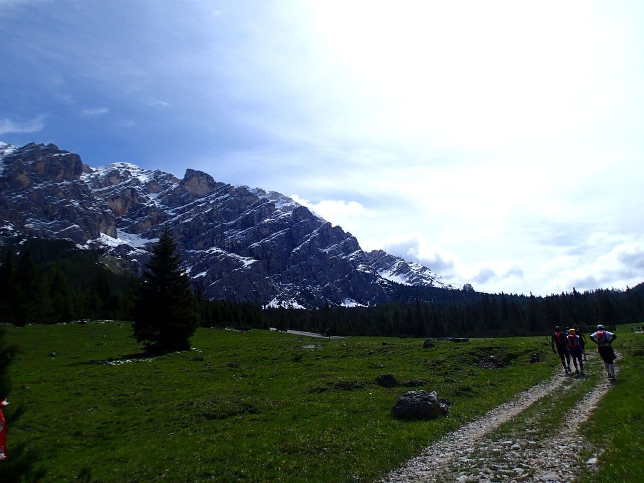Le paysage s’annonce magnifique. On avance le long de la vallée nord-sud qui mène au sommet capé de blanc du Croda Rossa.