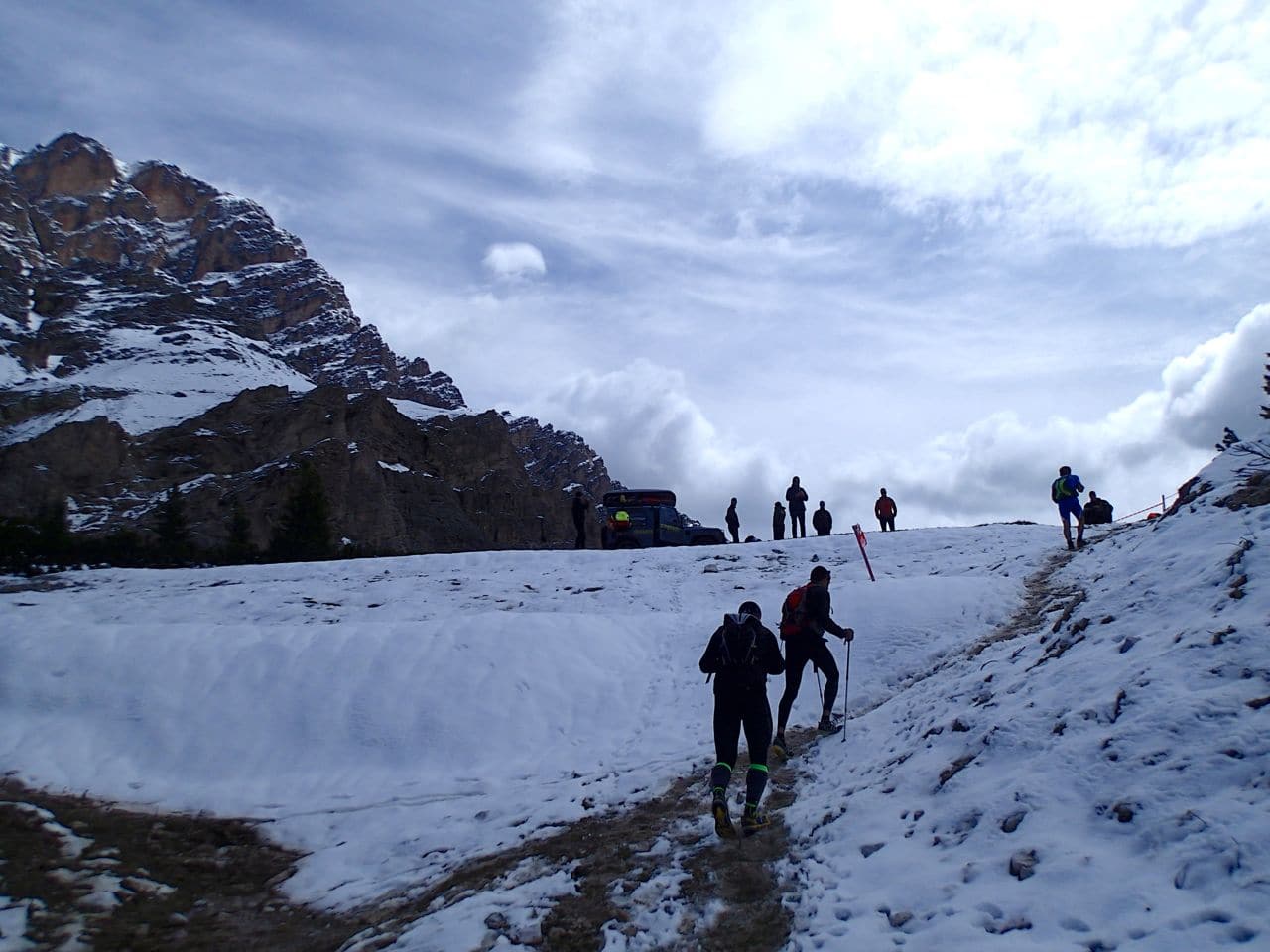 Le départ est prévu pour 23h, avec un briefing à 18h. Aux alentours de 16h, la nouvelle tombe, comme la neige la nuit précédente : lourde et glacée. À cause des 30cm de poudreuse, les passages de Tre Cime Lavaredo, Val Travenazes, Cinque Torri et Passo Giau sont impraticables. Autant de noms qui m’ont fait rêver et baver d’envie… Du coup, au lieu des 120K/5500m+ on tombe à 85K/3400m+. Une toute autre course, plus roulante, plus rapide. De plus, quatre randonneurs frigorifiés ont du être secourus la nuit précédente, les températures descendant à -6°C la nuit. Donc le départ se fera de jour, le samedi matin à 8h. Durant le briefing les organisateurs diront n’avoir jamais vu de la neige et de telles températures en cette période de l’année… Je sens ma tête s’enfoncer dans mes épaules, j’ai l’impression que les 1500 participants entassés dans l’auditorium ont les yeux braqués sur ma nuque. Désolé les gars… Le mauvais sort s’acharne sur moi encore et encore ! Ça devient lourd, là !