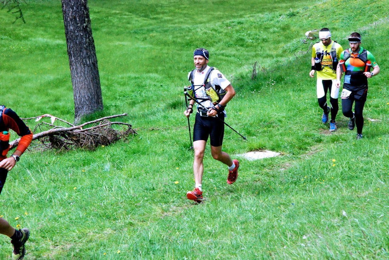 Double erreur. La première, ne pas m’être arrêté au ravitaillement de Malga Ra Stua : cela fait 20K que je cours sans m’arrêter. La deuxième : il y a une côte, finalement. 400m environ, pas grand-chose. Mais la pente est très forte, la plus prononcée des pentes depuis le départ ! Elle coïncide avec un moment de moins bien : le dénivelé qui s’allie avec la baisse de régime ne vous laisse que peu de chance. Je rame. Je me force à avaler deux ou trois pâtes de fruit. Peine perdue. Mes jambes sont en coton. Je me fais doubler dans la montée ! Tant pis, je laisse filer, le but est de passer en mode économie le temps que la forme revienne. On franchit la passe de Posporcora.