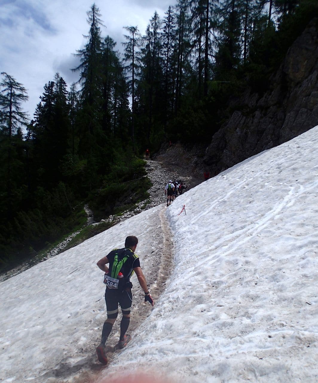 Misurina. Re-pointage. Re-ravito. J’en profite cette fois pour me changer : sosset-secs, chaussures, t-shirt, buff. Effet garanti, je repars comme neuf ! Mes pieds douloureux, nouvellement crémés, sont soudain légers. Un derniers petit signe à ma petite femme et à mes deux grands qui sont venus me soutenir (présents à tous les ravitos ! ) et je repars. Normalement, une longue ascension aurait du s’en suivre pour aller rendre visite à Tre Cime di Lavaredo, l’emblème de la course.