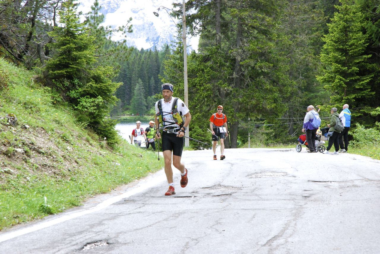 Pointage, on refait les niveaux d’eau. Le ravito est bien achalandé, à l’italienne : il y a carrément des biscottes tartinées de confiture et même de nutella ! On pourrait prendre son petit dej dans les ravitos italiens ! Je repars rapidement, 500m d’une ascension qui s’avérera facile, le prochain ravito en ligne de mire. Sauf qu’un long déroulé sur une piste cyclable le repousse continuellement à l’horizon. On croit qu’on arrive, car on s’approche des rives du Lago di Misurina. Mais la piste ennuyeuse à souhait le longe, en fait doucement le tour… Il faut courir sans arrêt sous peine de chuter à vitesse grand V dans le classement général. C’est un peu l’image de cet ultra : courir, courir, courir ; le dénivelé s’est transformé en vitesse de pointe. Comme je ne suis pas du tout entraîné pour maintenir une vitesse élevée pendant aussi longtemps, je commence à avoir les cuisses qui tiraillent. Elles demandent de la pente, je n’ai que des faux plats rapides à leur offrir.