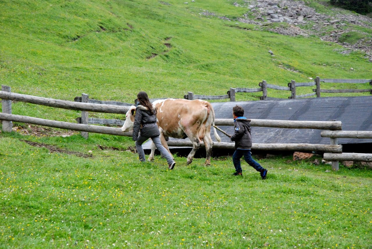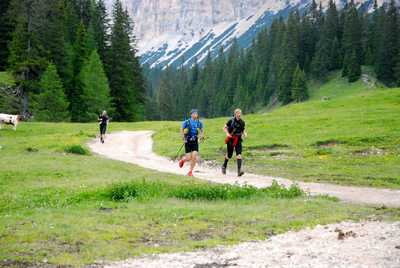 Il y a beaucoup de monde installé au re-re-re-ravito de Malga Ra Stua. Alors, aussi parce que j’en ai un peu marre, j’opte pour une tactique à brûle-pourpoint : je zappe le ravito. Mon camel est quasiment plein, j’enfourne un gâteau sec et un bout de fromage (parmigiano reggiano !) – un petit coucou à mes deux grands dadets qui s’amusent à taper le cul des vaches – et je file, doublant du coup une vingtaine de concurrents.