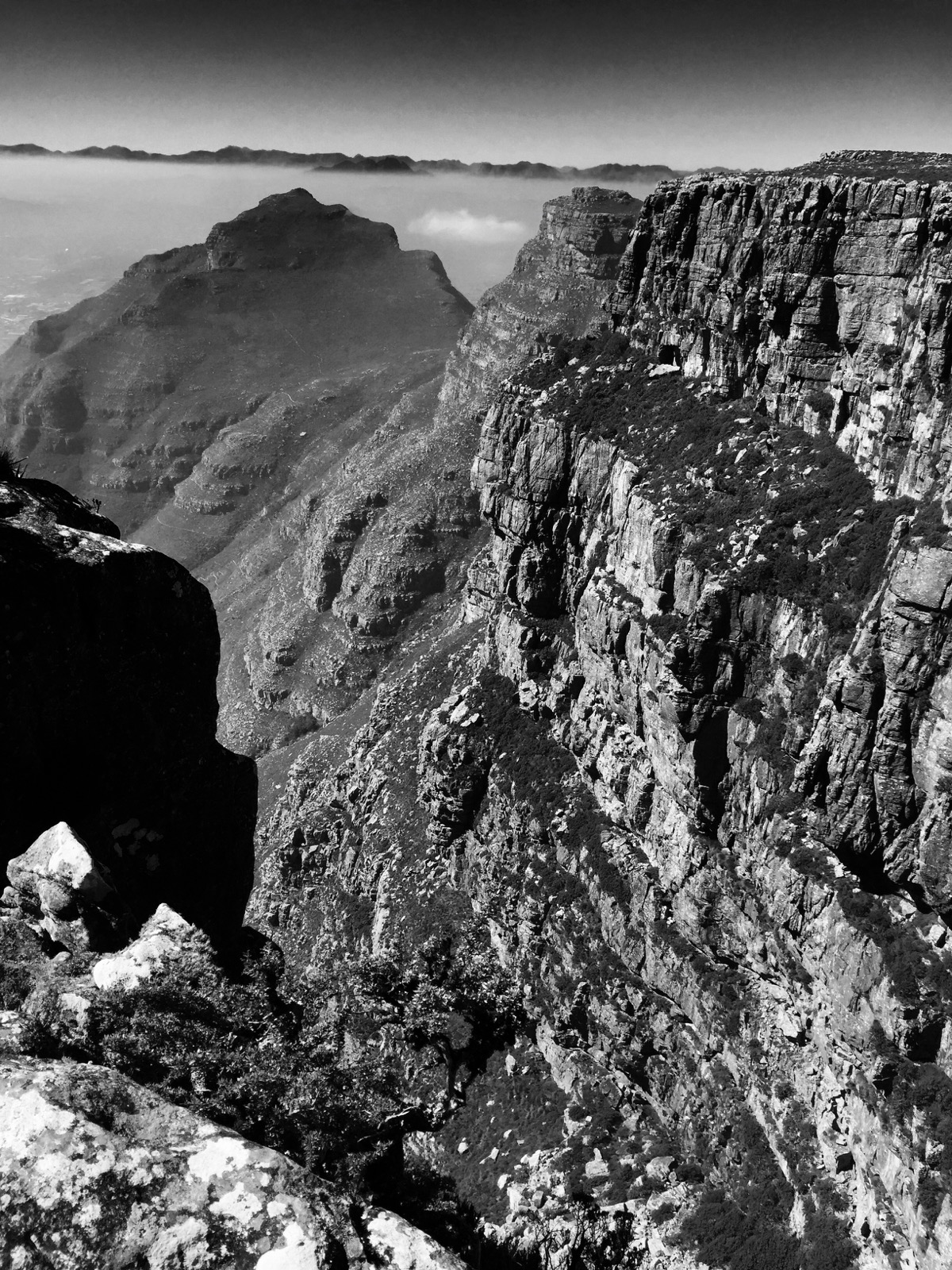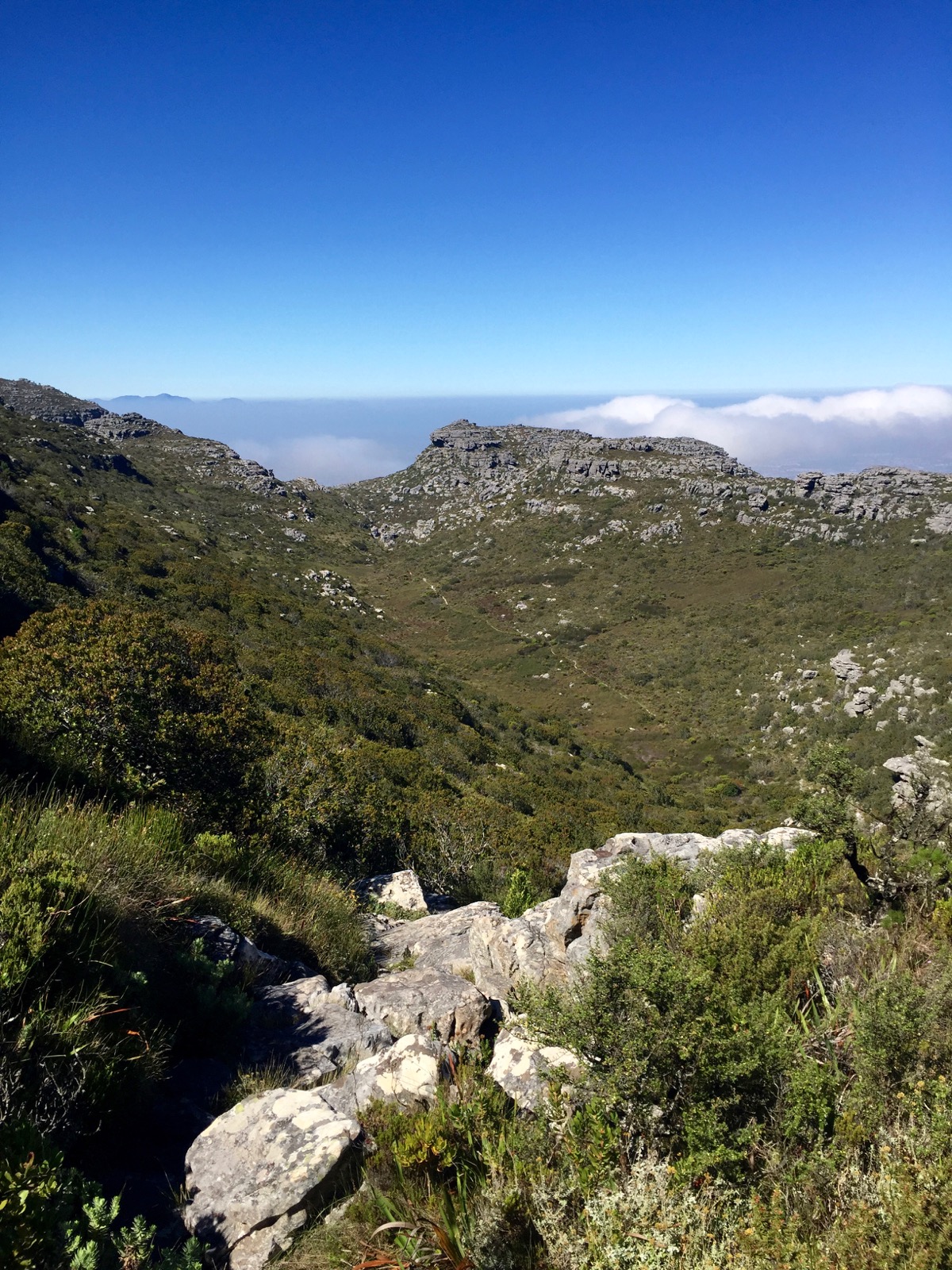 J’entreprends de longer la falaise, afin de faire le tour du plateau. Au loin, des rentrées maritimes envahissent les premières hauteurs de la montagne, sous la poussée orographique. Quand les couches de nuages s’étalent complètement sur la Table, on dit que la » nappe est mise « .